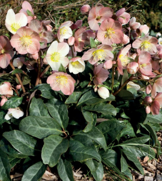 Popis: Trvalka dorůstající do výšky 30 - 40 cm. Listy jsou složené, jemně pilovité, stálezelené. Květy jsou velké, plátky květů přecházejí od barvy bílé po starorůžovou. Kvetení začíná už během zimních měsíců